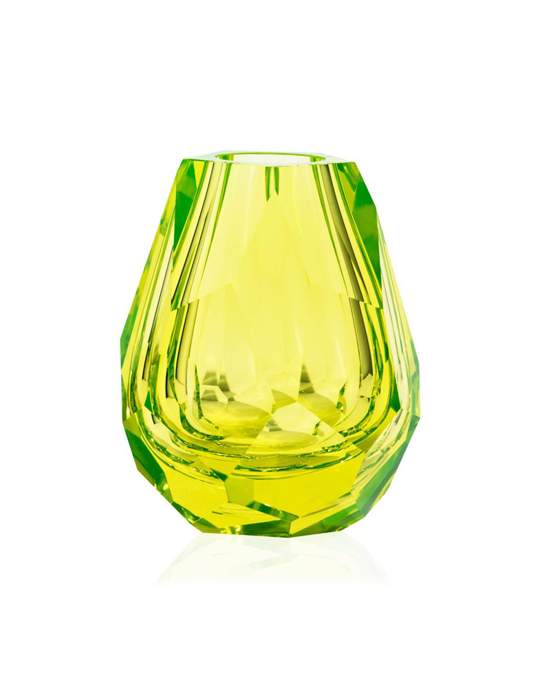 Vázy a mísy ručně foukané do dřevěných bukových forem. Síla stěny je masivní aby následným broušením do velkých hlubokých ploch vynikla nadčasová kubistická geometrie a záře jedinečné uranové skloviny. Váza svou jemnou zářivou barvou rozsvítí každý interiér.POPTÁVKOVÝ...