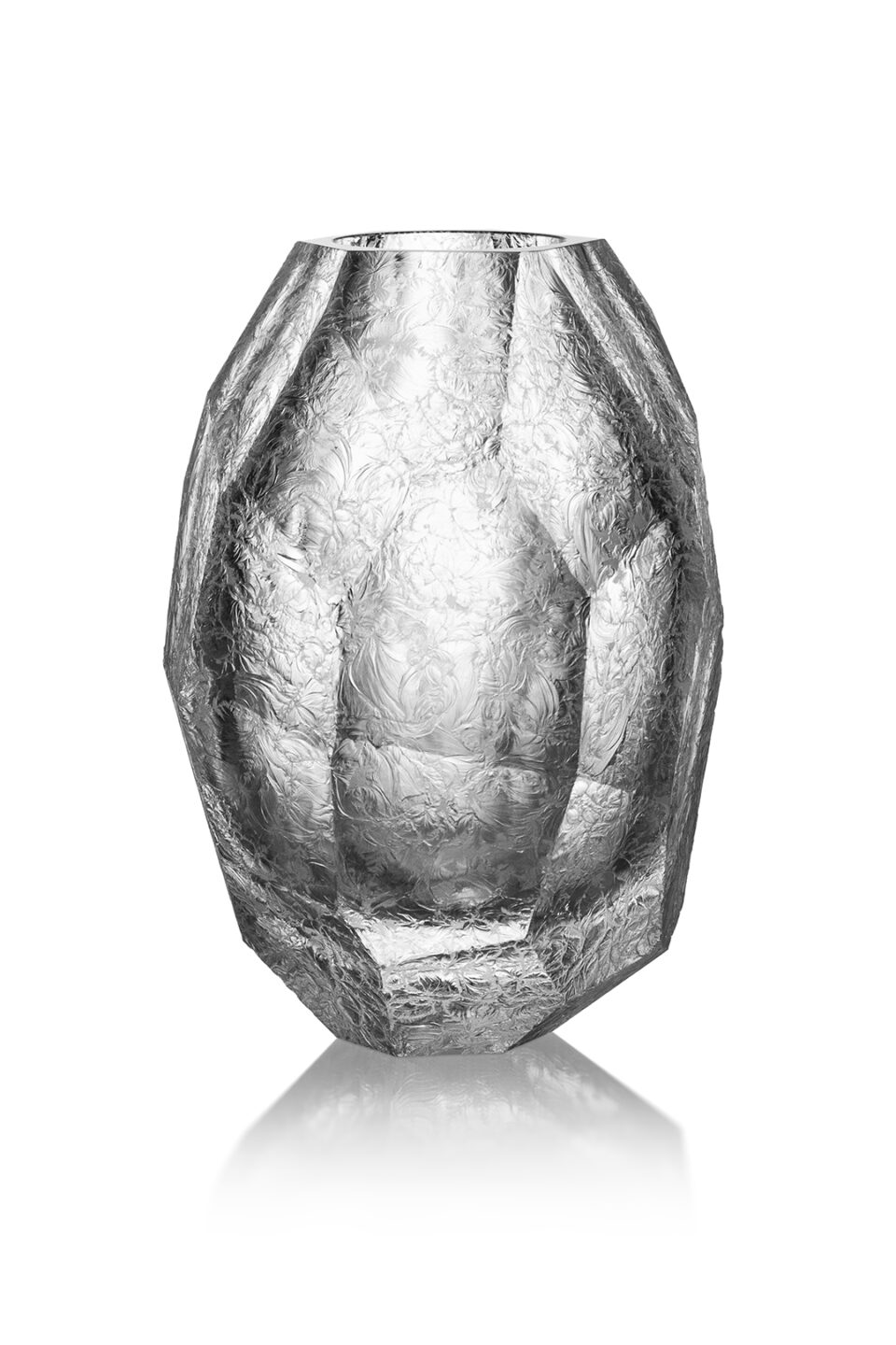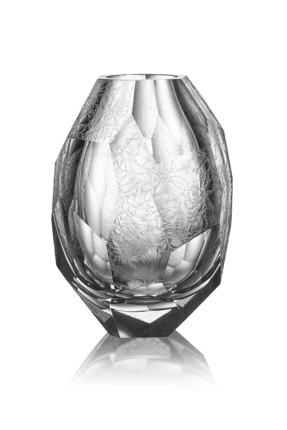 Ručně foukaná váza v kombinaci bílý opál vrstvený šedou sklovinou. Váza je ručně broušená hranovým brusem do velkých radikálních ploch. Vzniká jedinečný kontrast mezi vnější šedou broušenou vrstvou, která místy tajuplně prosvítá a vnitřní částí vázy, která je...