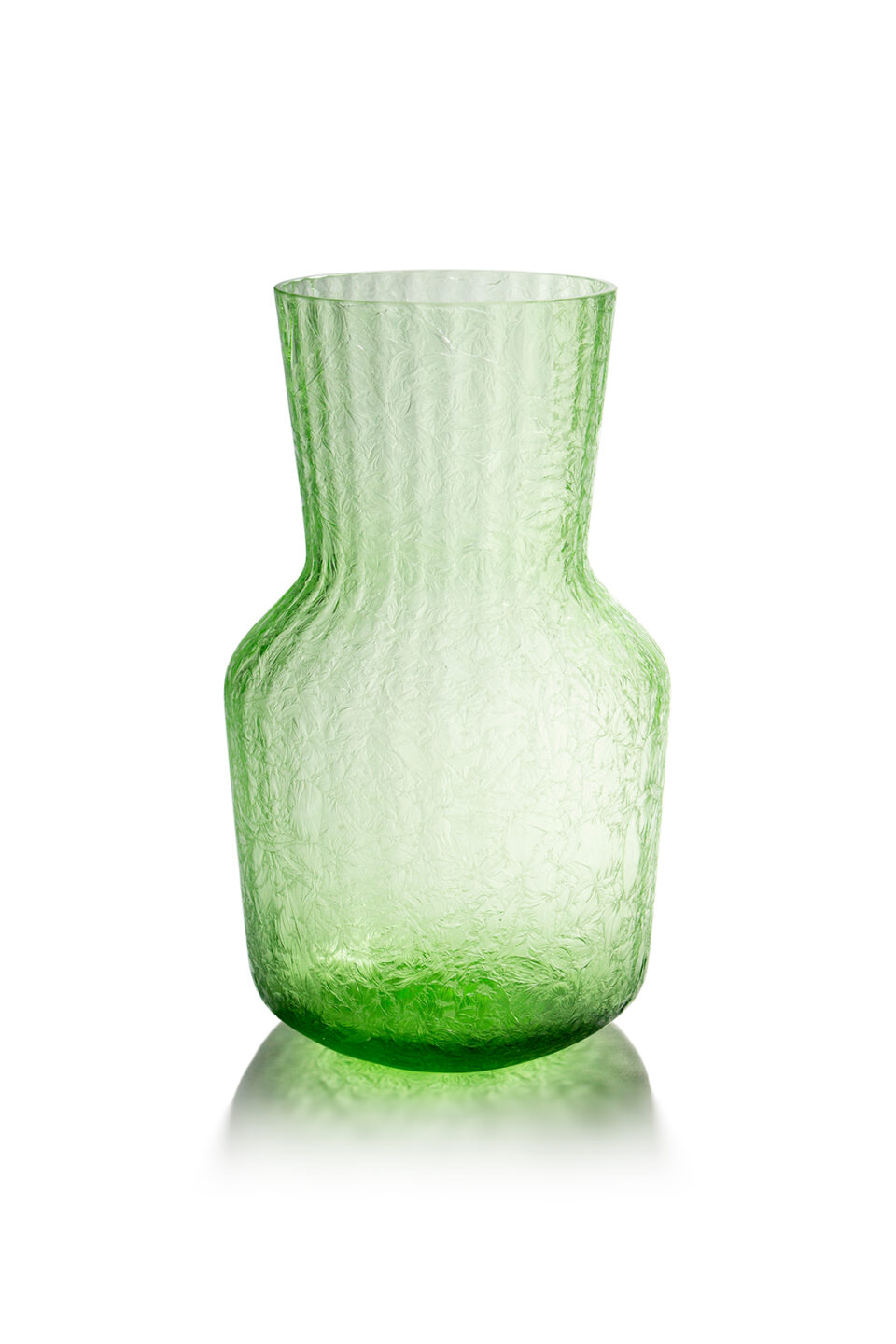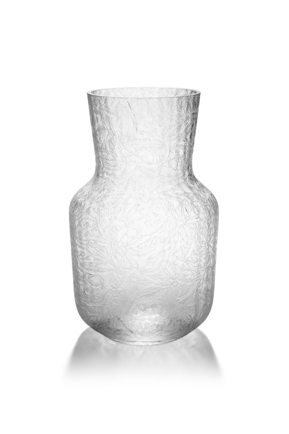 Vázy pokryté mrazem Ručně foukané vázy z bezolovnatého křišťálového skla v různých barvách skloviny. Vázy jsou foukané do žebrované vertikální optišky a následně za studena ledované klihem, který vázám vytvořil unikátní ledový reliéf, jež působí jako pokrývka mrazem....
